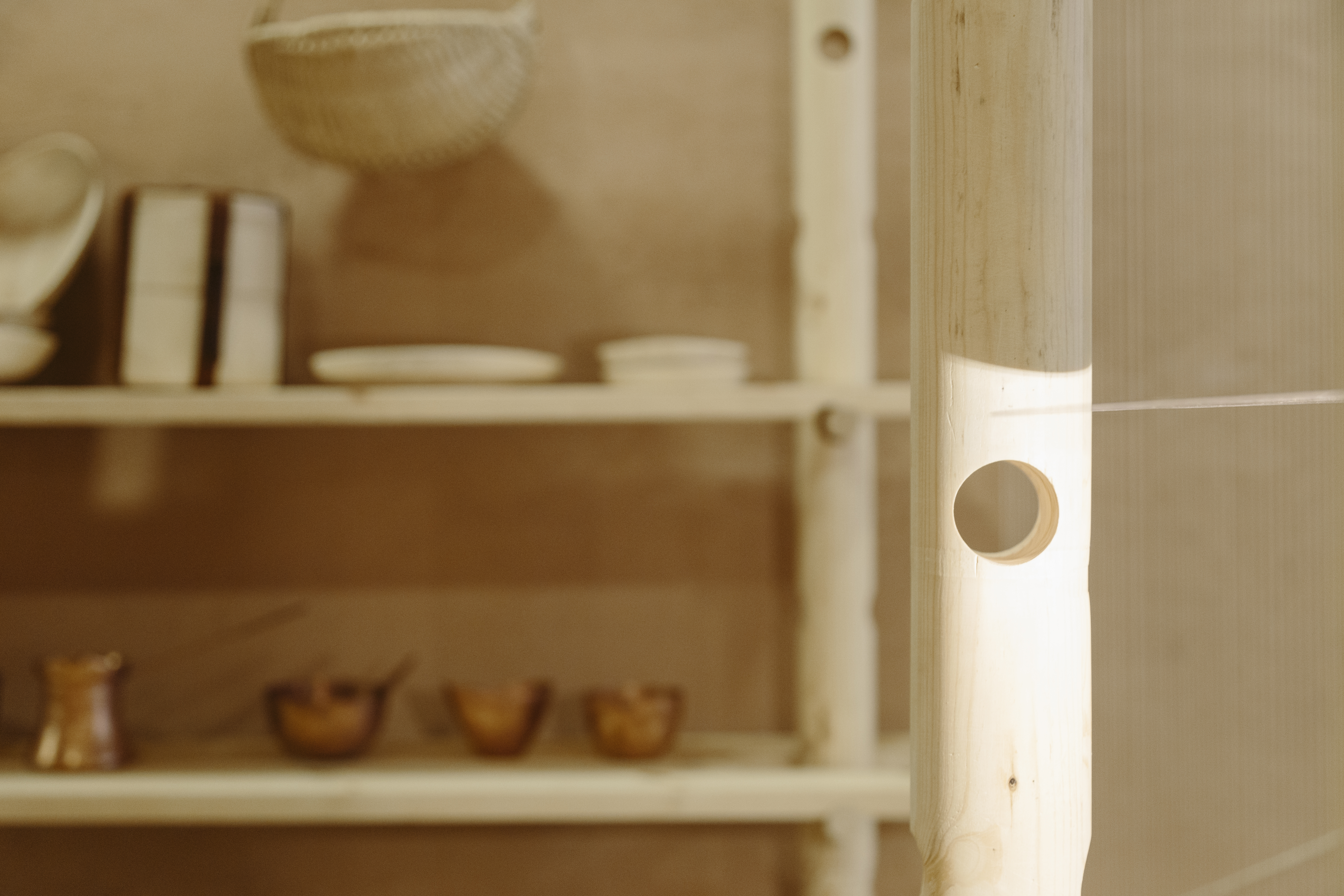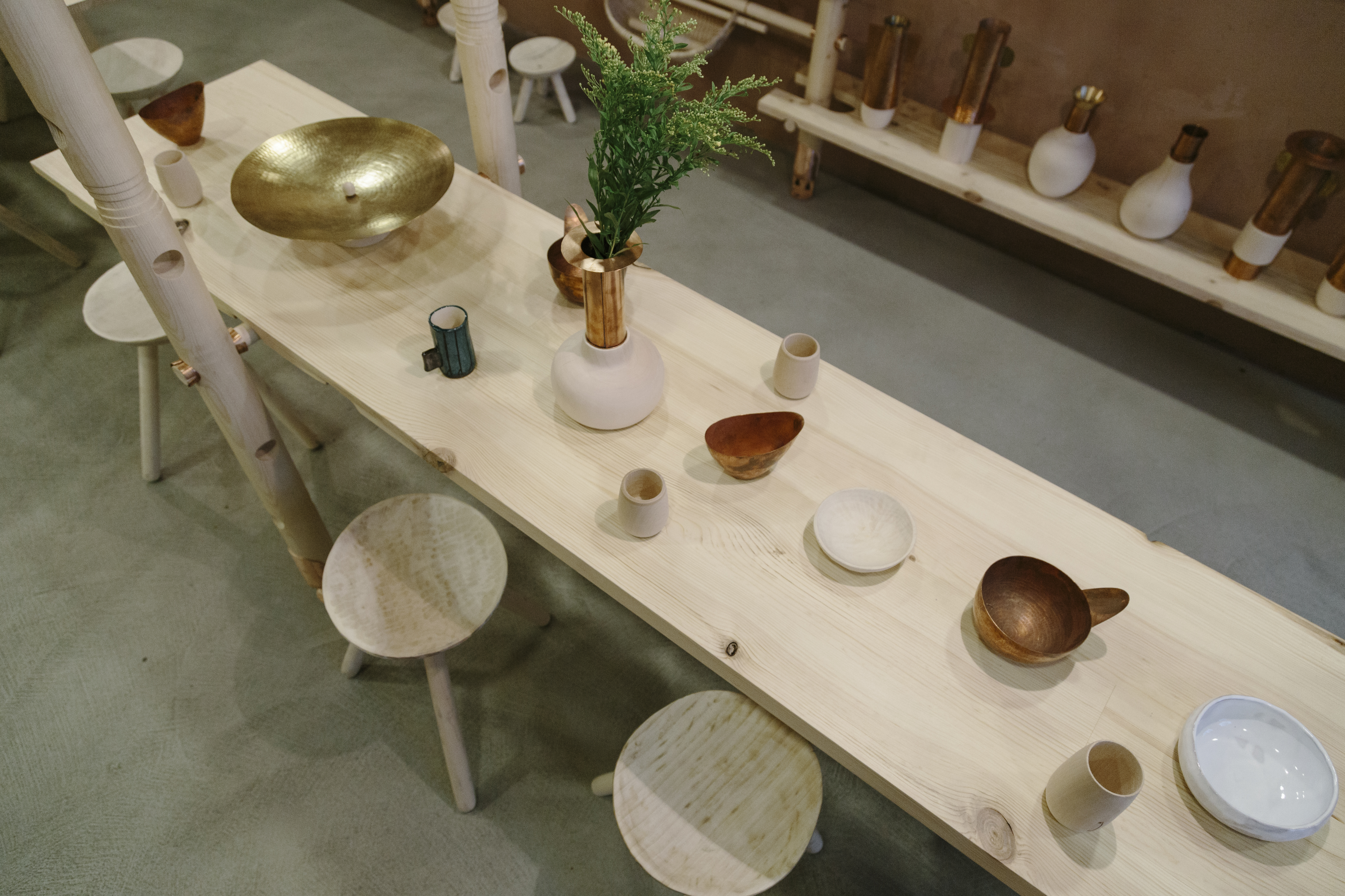 For the exhibition of the final products we proposed a flexible structure, able to be reformulated for different types of objects, different proportions or scenarios, giving the shop the freedom to change in time the selections and the focus of its curricula. It is a simple linden structure made of flute-columns waiting for their beams that can support either shelves or hooks. The assembly will use handmade copper joints.